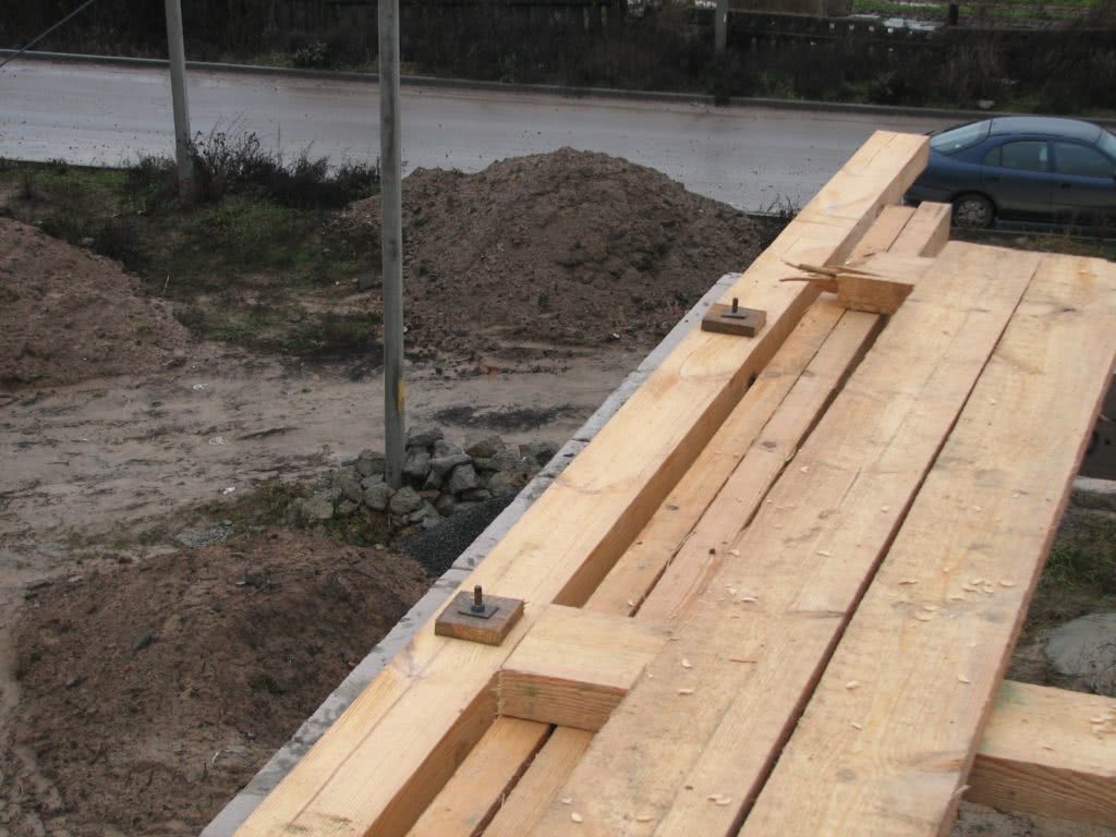 - Для укладки опорного бруса необходимо возвести цельную бетонную отмостку по периметру всего здания. После высыхания бетонной стяжки на ее поверхность необходимо уложить в несколько слоев гидроизоляционный материал, рубероид отлично подходит для этих целей. Далее в бетонную отмостку устанавливают специальные металлические шпильки диаметром не менее 10 мм. После чего опорный брус “надевают” на установленные шпильки, для этого в нем необходимо заранее высверлить отверстия. Помните, что концы шпилек должны будут выступать минимум на 10 мм. Последующую фиксацию осуществляют посредством гаек.