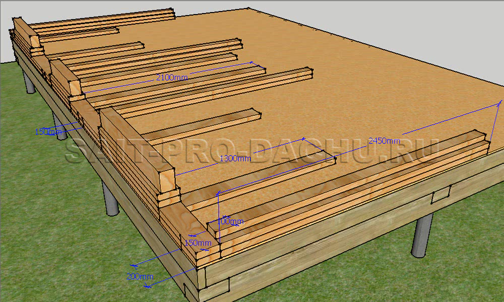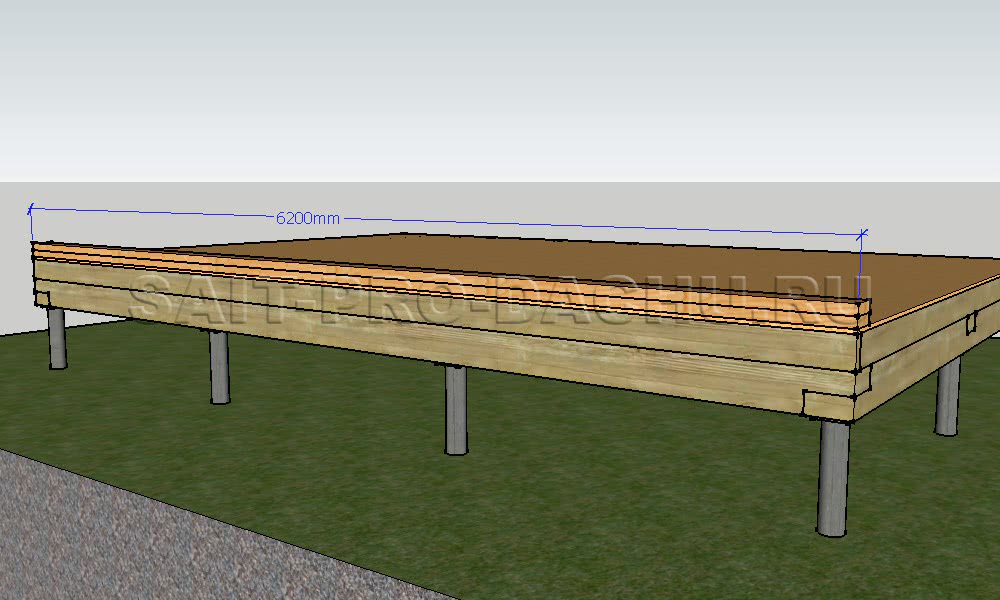 - К балкам обвязки с равным шагом (70 см) крепим лаги.