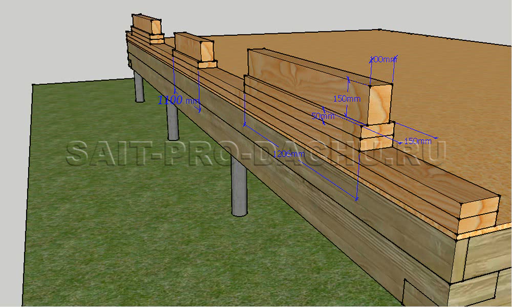 - Далее на столбы укладываются балки обвязки (брус 150х15 мм). В углах они скрепляются между собой и фиксируются к столбам при помощи анкеров или стальных скоб.
