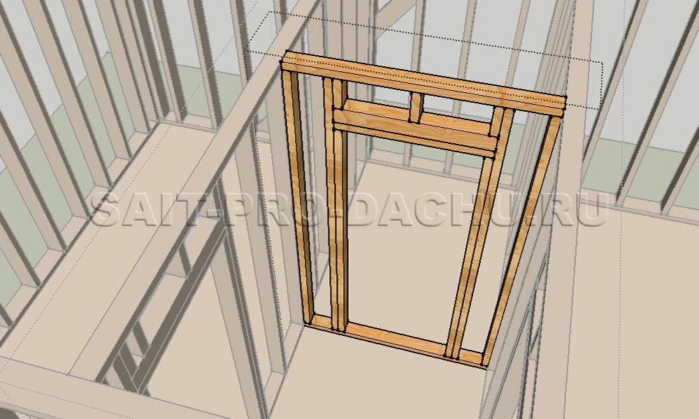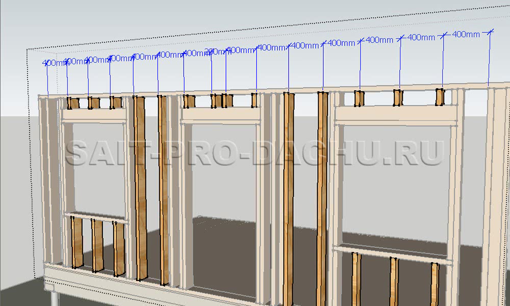 Дальше возьмите карандаш и пометьте на зафиксированных длинных обвязанных досках расположение всех проемов (по контурам ригелей), примыканий стен и простенков. Ну и это не все. Также исчертите обвязку, вместе с уложенными на них деталями вертикальной разметкой через каждые сорок сантиметров. Там где она попадет в толщу стены, положите по одной доске длинной 2450мм, где на окно – две доски. Одна длиной 750 мм, вторая 150мм. И наконец, где разметка встретит дверной проем нужно заготовить только пятнадцатисантиметровый обрезок.