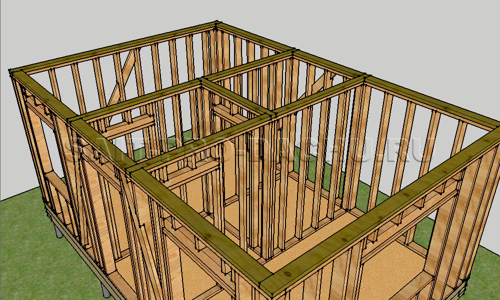 - Далее монтируем каркас стен. Его можно собрать на земле и поднять на балку или возводить прямо на обвязке. Второй вариант больше подходит для самостоятельного выполнения. Для каркаса стоит взять бруски сечением 50х150 мм. В углах дома для повышения жёсткости устанавливаются сдвоенные бруски.