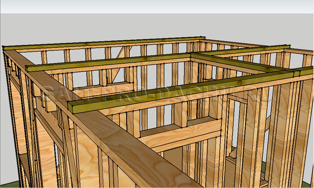 - После этого монтируется верхний обвязочный брус. Над оконными и дверными проёмами фиксируются горизонтальные балки каркаса. В углах дома для повышения жёсткости каркаса монтируются косые распорки с двух сторон.