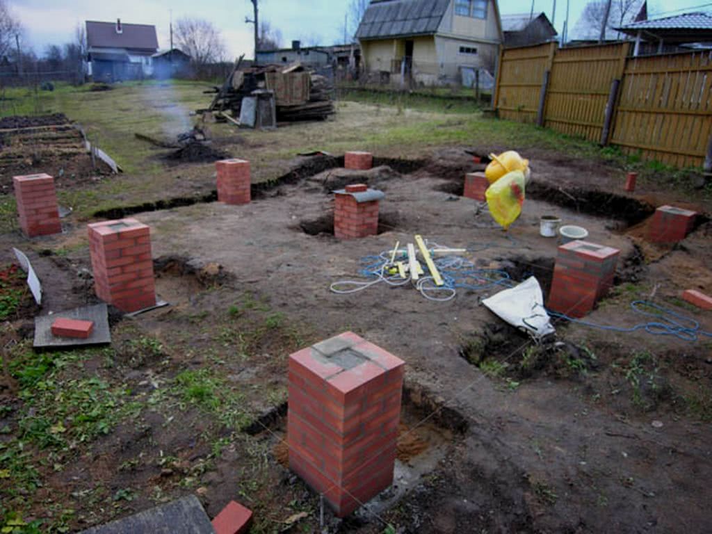- Постройка выполняется на простом столбчатом фундаменте из 12 опор. В качестве материала для столбов используется стандартный шлакоблок, но лучше отлить опоры из бетона в опалубке;