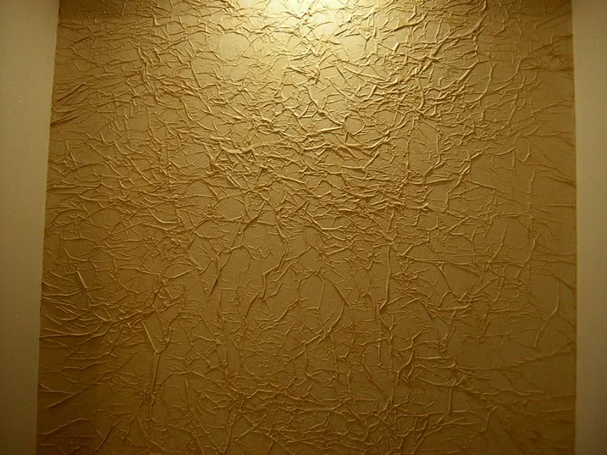 - Для декорирования стены можно использовать рельефную ткань. После того как шпаклевка была нанесена на стену и слегка подсохла, берем маленький кусок ткани и прислоняем к поверхности. Таким образом, естественный рисунок ткани перенесется на стену.