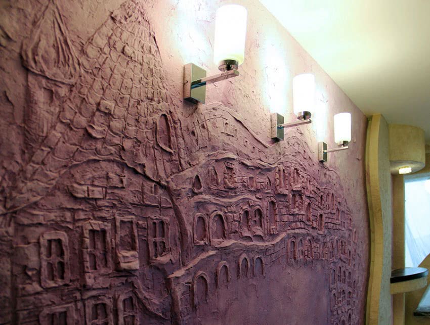 - можно использовать какие-нибудь рельефные предметы, оставляя с помощью них отпечатки на штукатурке;