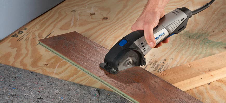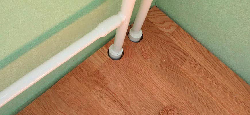 После измерения отмечают на панели отверстия диаметром 8-12 мм больше соответствующего размера труб. Лобзиком вырезают фигурный фрагмент. После установки ламината этот элемент закрепляют на месте клеем.