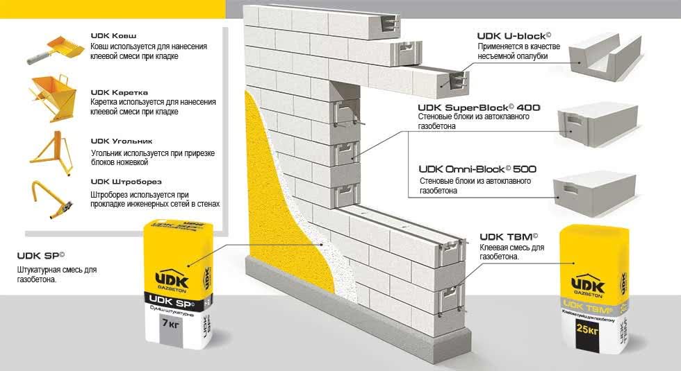 - при сооружении стен из газобетонных и керамзитных блоков, кирпича, пенобетона, шлакоблоков;