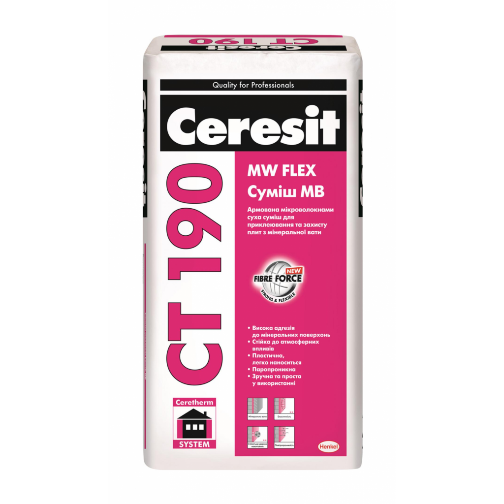 - Ceresit CT190 . Этот клеевой раствор отлично приклеивает и в дальнейшем защищает фасадную систему от внешнего воздействия. Помимо способности прикреплять утеплитель из минераловатного материала, ещё он нередко используется для фиксации внутренних утеплителей в помещениях здания. Он обладает повышенными адгезийными свойствами по отношению к органическим материалам, устойчив к атмосферным воздействиям, пластичный, паропроницаемый, экологически безопасный, удобный в использовании, можно наносить на металл. Стоимость: 530 рублей за упаковку массой 25 кг.