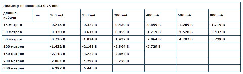 При большом удалении камер, будет проблематично передать требуемые для питания 12В. Вот например таблица потерь напряжения для КВК при сечении 0,75мм2 в зависимости от удаленности камер и их мощности.