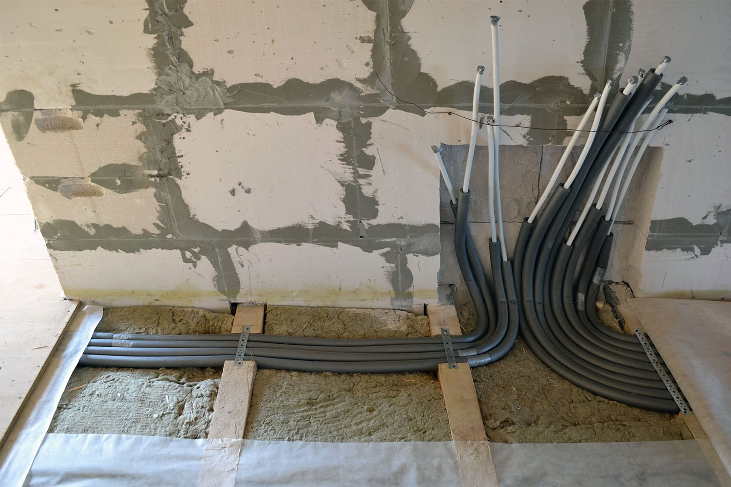 - Завершающий этап — заливка стяжки и заделывание штроб на стене. Только после высыхания бетона, через 21 день, можно укладывать напольное покрытие, и включать систему.