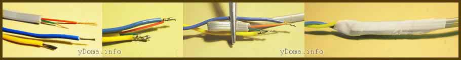 Чтобы скрепить два или несколько проводов, их концы зачищали от изоляции на расстоянии 2-4 см, в зависимости от диаметра проводников. Сложив параллельно жилы, их скручивали в форме спирали. Контактный узел оборачивали изоляционной лентой. Делали это особенно тщательно, чтобы не оставалось оголённых участков контактного узла.
