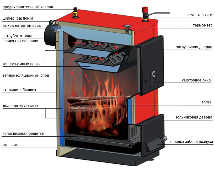 Все твердотопливные теплогенераторы обязательно имеют камеру сгорания, теплообменник и систему дымоотвода.