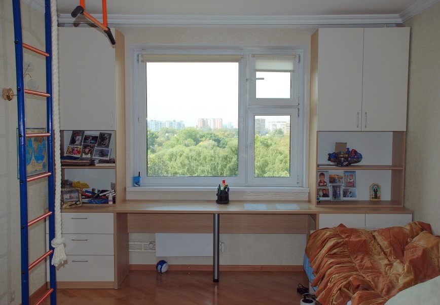 Бывает, что размеры детской комнаты не позволяют разместить большой и удобный стол рядом с окном. Тогда некоторые родители трансформируют под рабочий стол широкую столешницу-подоконник. Но лично я не сторонник такого решения. Свет, падающий на письменный стол прямо из окна, слишком яркий и будет ослеплять ребенка, особенно в ясные и солнечные дни. Возможно, на выручку смогут прийти полупрозрачные варианты ролштор, частично блокирующие свет, но все равно, такое расположение, не самое лучшее.