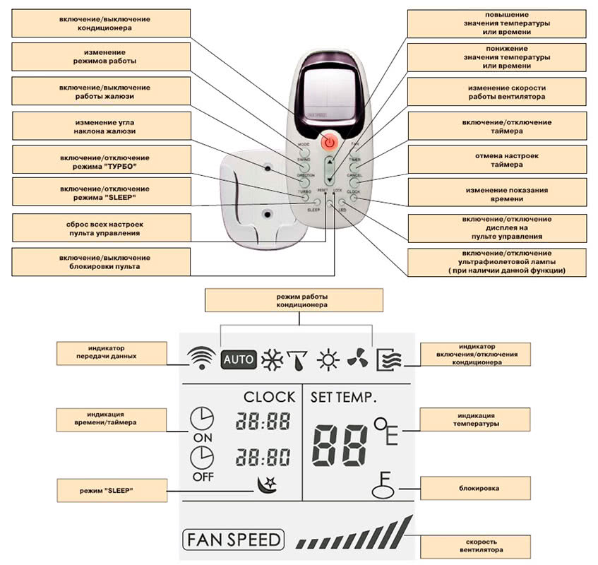 Количество кнопок и их значения зависит от марки кондиционера. На кнопки наносятся символы или они могут иметь просто надпись.