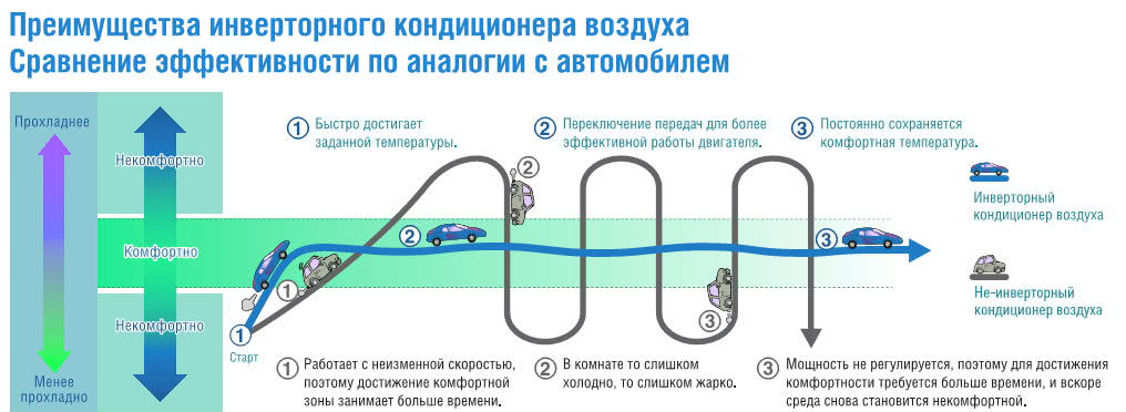 В обычных кондиционерах компрессор может работать только на полной мощности. При достижении заданной температуры он отключается, а затем, когда комната нагреется, снова начинает работать. Такой рабочий режим имеет несколько недостатков: