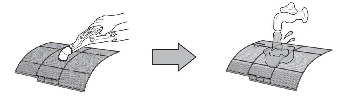Извлеките фильтр и очистите его с помощью пылесоса, чтобы удалить крупные частицы пыли и грязи. Затем промойте фильтр под струей воды. Воспользуйтесь щеткой с мягкой щетиной, если это необходимо. Также рекомендуем приобрести специализированное средство для очистки кондиционеров.