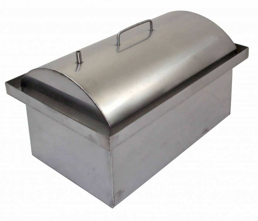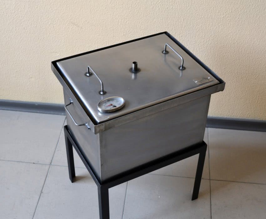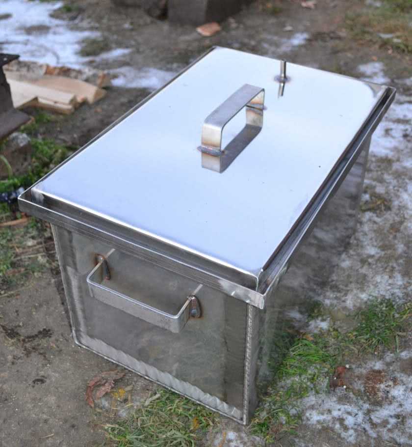 Чтобы сделать надежную коптильную камеру, выберите прочный металл – нержавеющую сталь. С виду такая конструкция похожа на короб. Во внутренней части приваривают уголки для двух металлических решеток.