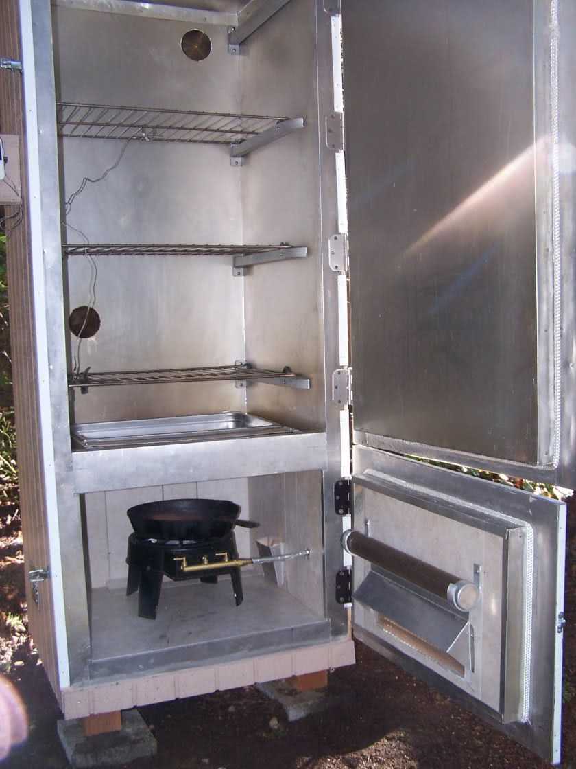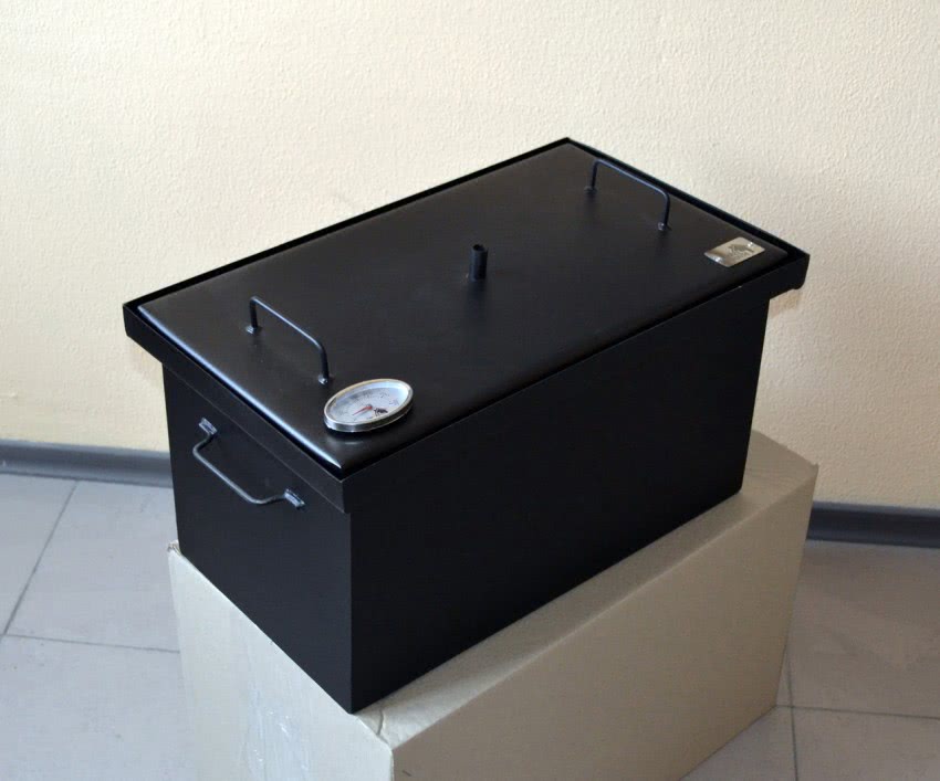 Так как внутри коптильной камеры будет температура до 150 градусов, лучше для её изготовления использовать металл. Хвойные породы дерева применять нежелательно — при нагреве испаряется смола, пропитывая запахом продукты. Также не рекомендуется делать из фанеры или МДФ. Склейка этих материалов выполняется на формальдегидный клей, который будет испаряться и частично проникать в копчёности.