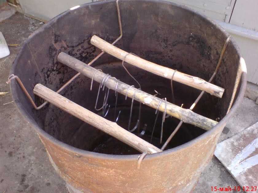 Сделайте коптильню из железной бочки: это решение наиболее доступное. Для начала отрежьте днище емкости, закрепите на ней решетку (или арматурные прутья) на 2-х уровнях.