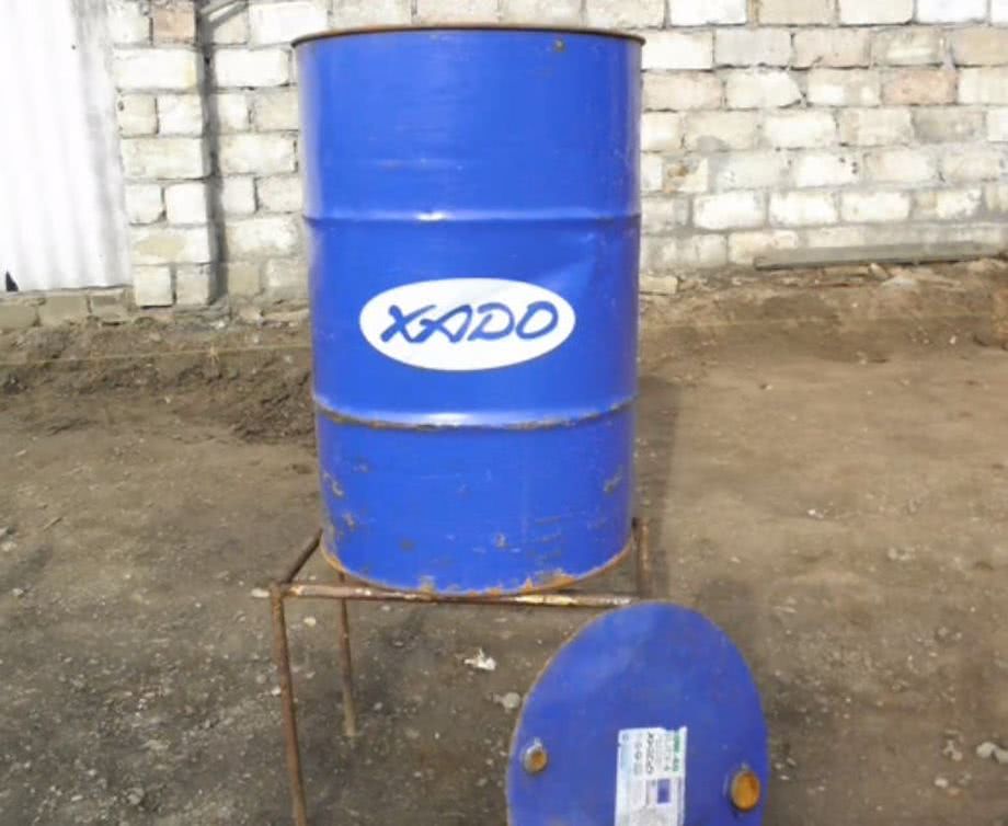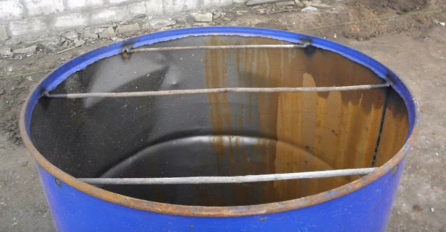 Сделайте коптильню из железной бочки: это решение наиболее доступное. Для начала отрежьте днище емкости, закрепите на ней решетку (или арматурные прутья) на 2-х уровнях.