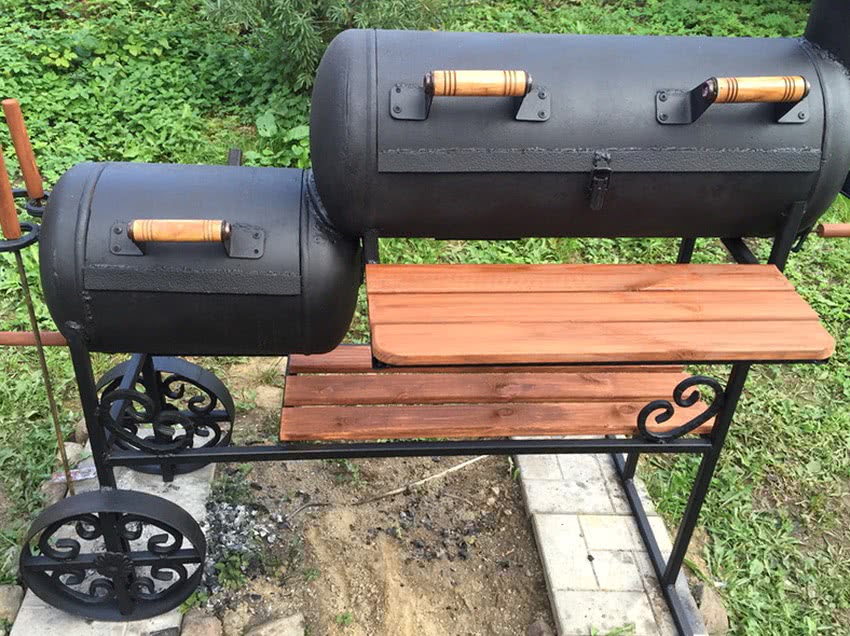 Правильный подход к декорированию готовой конструкции позволит превратить коптильню в уникальный элемент экстерьера. Придать оригинальности помогут кованые детали: ножки, ручки. Для удобства перемещения аппарата по территории монтируются колесики. Монтаж дополнительной столешницы и подставок для продуктов, дров и посуды, ускорит и упростит процесс приготовления. Для газовой емкости, бывшей в эксплуатации длительное время, важна покраска. Это не только сделает внешний вид привлекательным, но и продлит срок службы конструкции. С помощью термостойкой краски удастся скрыть сварные швы, защитить поверхность от коррозии и воздействия высокой температуры. Для покраски выбирают термостойкие лакокрасочные составы. По цвету ограничений нет, но практичнее использовать черную краску. Она хорошо скрывает следы гари и сажи.