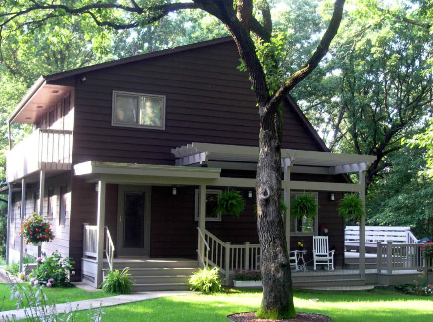 Кантри. Этот стиль лучше всего сближает дом с природой, поэтому данное стилевое направление будет оптимальным решением для загородных домов и коттеджей. При оформлении фасада рекомендуют применять только натуральные материалы. Так как коричневый цвет является природным, то при оформлении фасада можно применять дерево, деревянные панели и прочие материалы, имеющие подобный цвет или его оттенки. Шикарно смотрится дом, выполненный из бруса, как оцилиндрованного, так и обычного. Брус имеет нежный и приятный светлый тон коричневого цвета, а значит, изобилие декора здесь не понадобиться. При оформлении фасада здания можно использовать пастельные тона, которые считаются натуральными
