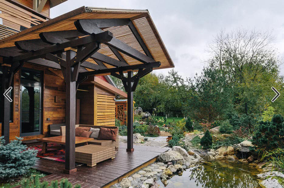 Вагонка применяется и для внешней отделки стен дачного домика, ею подшивают крышу террасы, свесы кровли. Разные виды непрозрачных красок предотвращают потемнение дерева на свету, создают своеобразный ультрафиолетовый фильтр.
