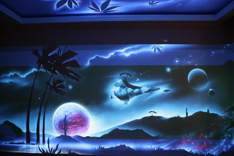Технология будет определяться конечной целью. Можно, например, использовать такую краску для выделения части картины или панно на стене, а можно применить ее для окрашивания большого участка поверхности. В зависимости от этого выбирается тип флуоресцирующего пигмента.