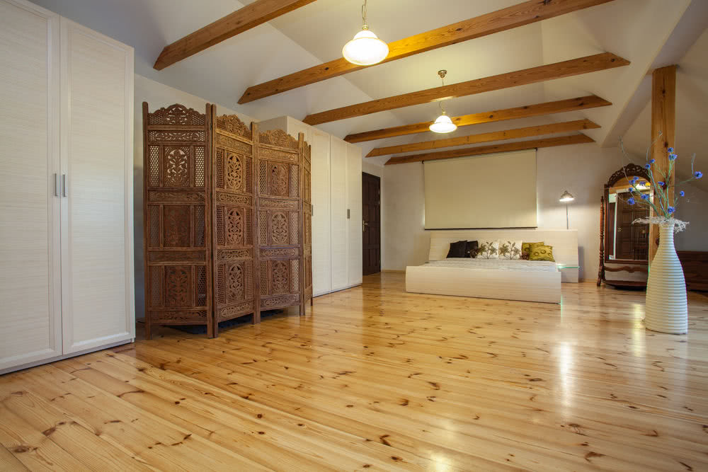 Дуб и ясень — очень красивые лиственные породы с плотной износоустойчивой древесиной. Но цена на них совсем негуманная. Как и в предыдущем варианте пол из этих пород дерева может использоваться без покрытия или с более щадящими составами.