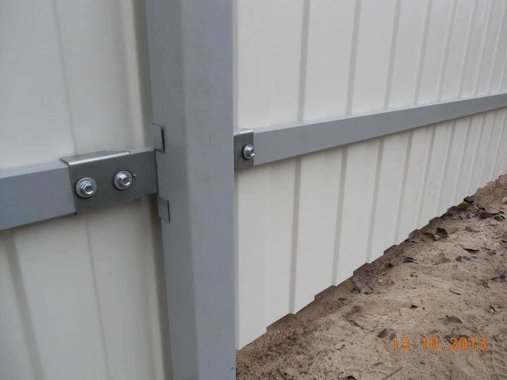 После того как бетон затвердеет (для этого понадобится не менее 5-ти дней), приступают к сборке каркаса забора. Для разборного соединения его элементов используют кронштейны с отверстиями, которые необходимо прикрутить к опорам. Если были применены готовые опоры, оснащенные специальными кронштейнами с отверстиями для крепления перекладин, последние прикручивают к ним. В этом случае в отдельно приготовленных держателях нет необходимости.