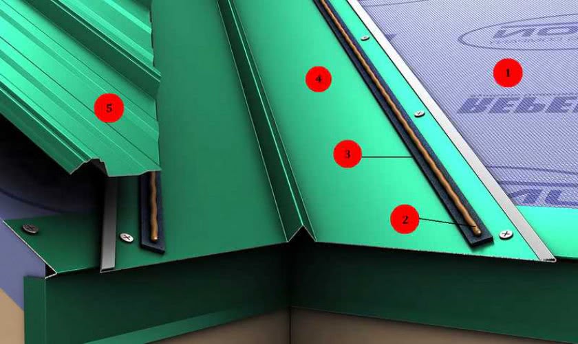 Конек крепится к обрешетке через верхнюю волну листа, что обеспечивает наиболее плотное соединение элементов конька с профнастилом. Кроме того, при небольших уклонах кровли рекомендуется в нижние волны профлиста под коньком устанавливать уплотнительные прокладки. Они препятствуют попаданию воды под конек при сильном боковом дожде.