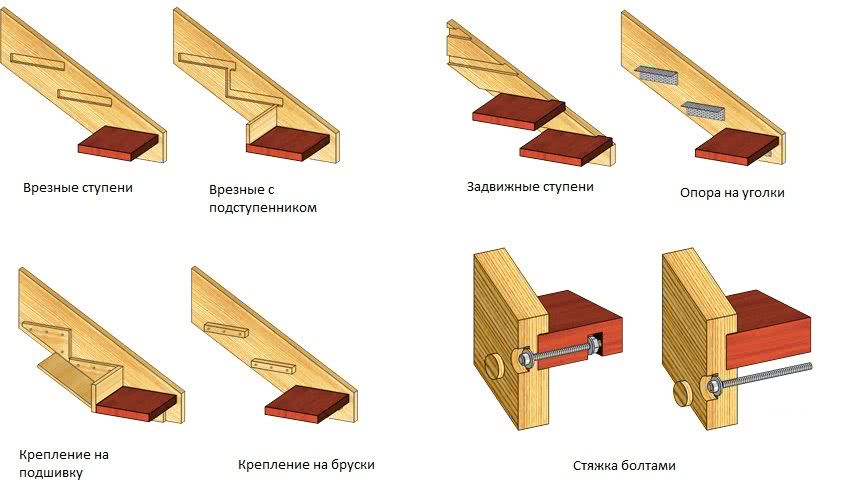 - соединение деталей в широкий паз на тетиве, в который торцом забивается ступенька. Это один из наиболее надежных и популярных методов для монтажа ступенек на тетивах.