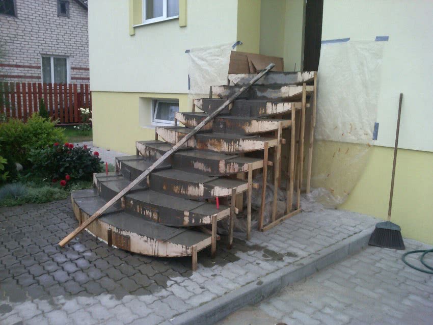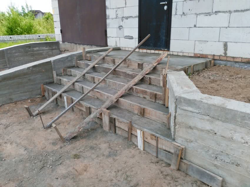 Непосредственно заливка ступенек. Подготовьте бетонную смесь, и начинайте заливку с самой нижней ступени. Далее потребуется немного времени для подсыхания бетона перед заливкой последующих. Таким образом заливайте каждую ступень.