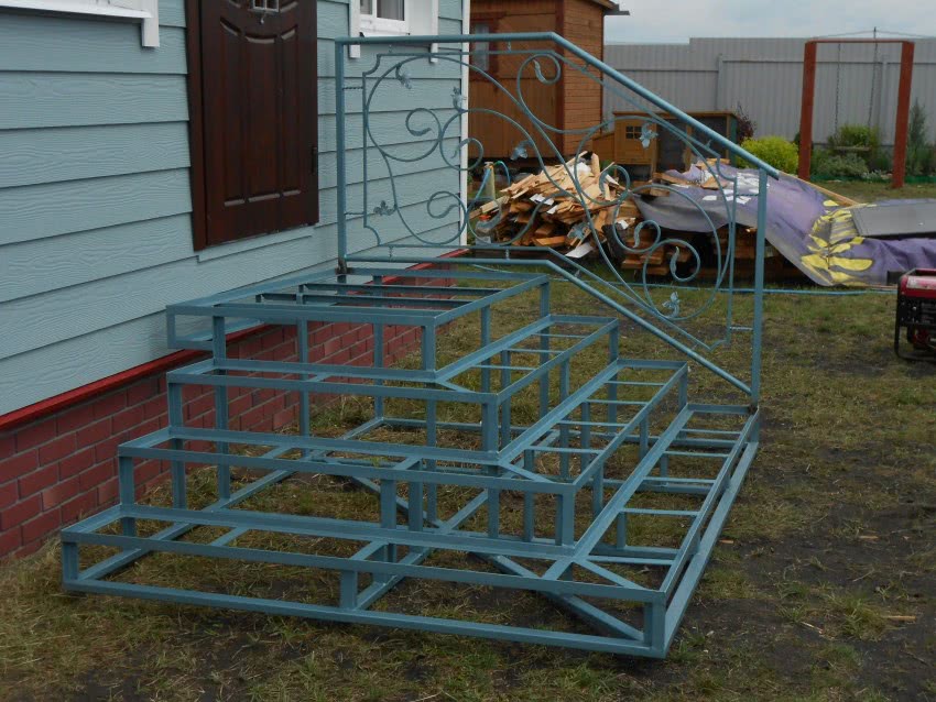 - Устанавливают опоры из трубы, уголки и профили, изготавливают каркас площадки крыльца, затем подготавливают тетиву из швеллера или металлического уголка. Последний также применяется для изготовления ступеней.
