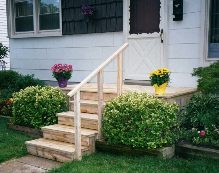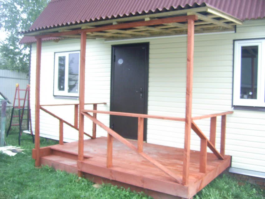 А следующем фото – обыкновенное деревянное крыльцо, на четырех опорах, открытое. Техника его строительства – самая элементарная, требующая минимум временных и финансовых затрат. В конце этой статьи вы узнаете, как построить деревянное крыльцо своими руками.
