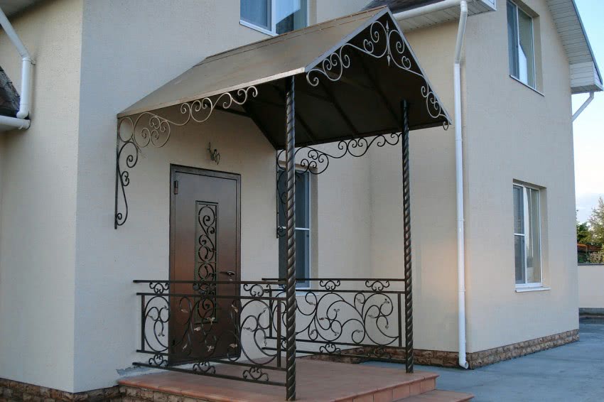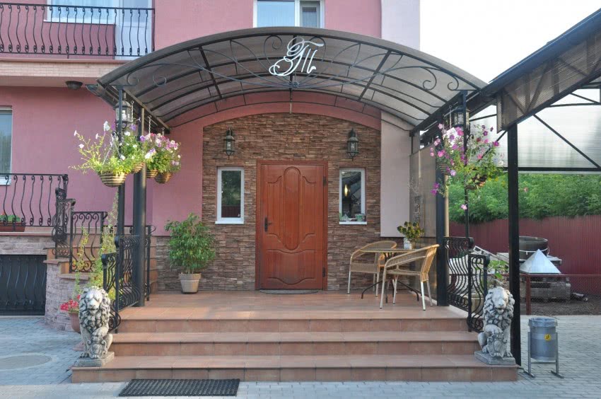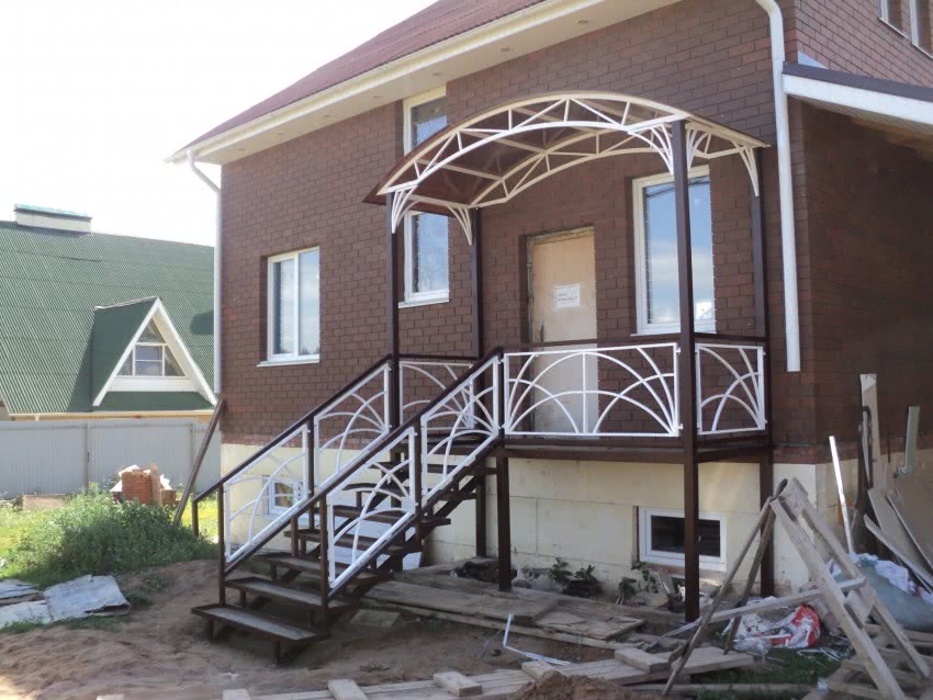 Придомовая площадка со ступеньками и металлическим козырьком. В качестве каркаса использовался металл с коваными элементами. Для достижения большего эффекта некоторые детали выкрашены в золотистый цвет. На крыше крыльца установлен металлический лист, окрашенный в водостойкую и устойчивую к выгоранию краску. Небольшая площадка и лестница в шесть ступенек дополняет общее оформление дома.