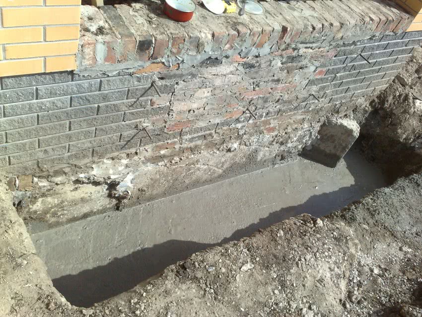 - Фундамент. Для того чтобы сооружение радовало качеством, нужно придерживаться правил. Делаем котлован под основу (глубина должна отвечать фундаменту). Это позволяет связать две конструкцию в одну, тем самым снизить риск разрушений. После этого готовим основу. Беремен кирпич колотого типа, улаживаем арматурную сеть – усиливает основу, связку фундаментов. Заключительный момент – забивание вертикальный арматурных штырей, заливка бетоном.
