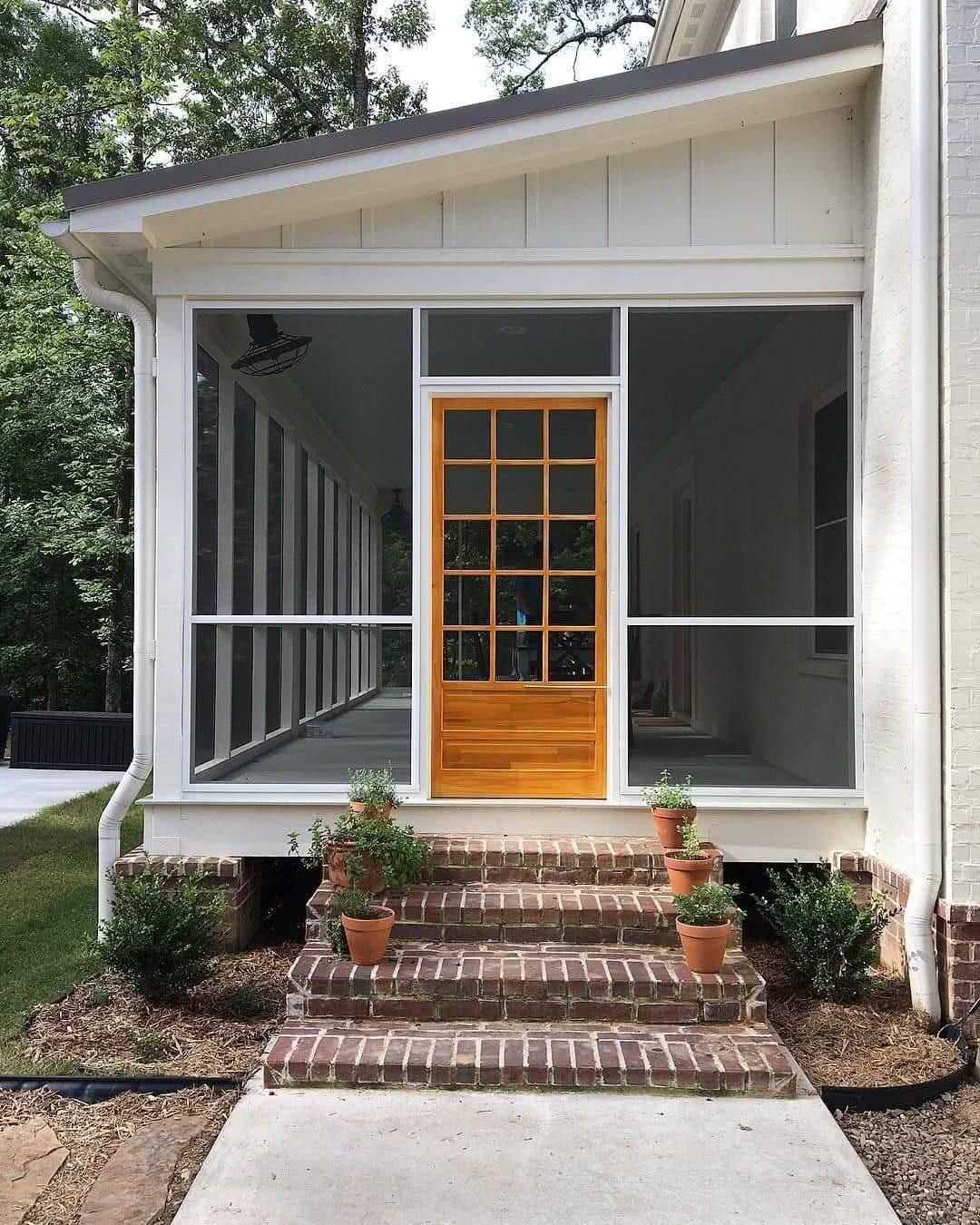На фото кирпичное крыльцо, пристроенное к веранде частного дома.