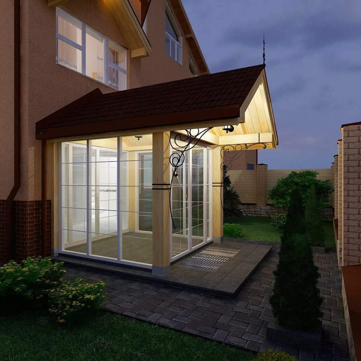 - Закрытое крыльцо. Такая вариация с боковыми стенами позволяет получить вход в дом, защищенный от внешних неблагоприятных воздействий. Чтобы сохранить освещение, боковые стены стеклят полностью или фрагментами. При расчете отдельных рам, учитывают, что их ширина не должна превышать 120 см, чтобы противостоять ветровым нагрузкам. Основной каркас стен выполняют в металлическом или деревянном варианте.