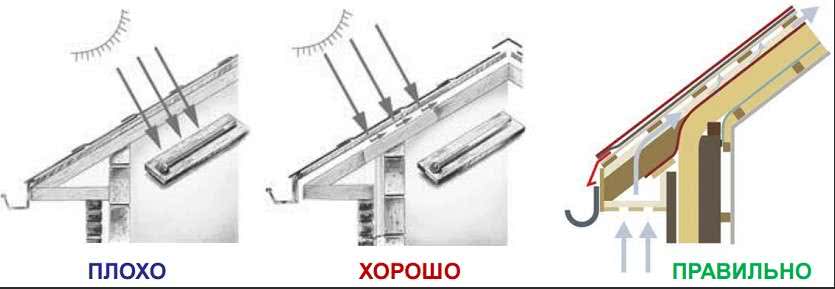 Правильно выполненная вентиляция позволит избежать на долгое время конденсата, тем самым увеличит сроки эксплуатации крыши из профнастила. Она состоит из следующих элементов: