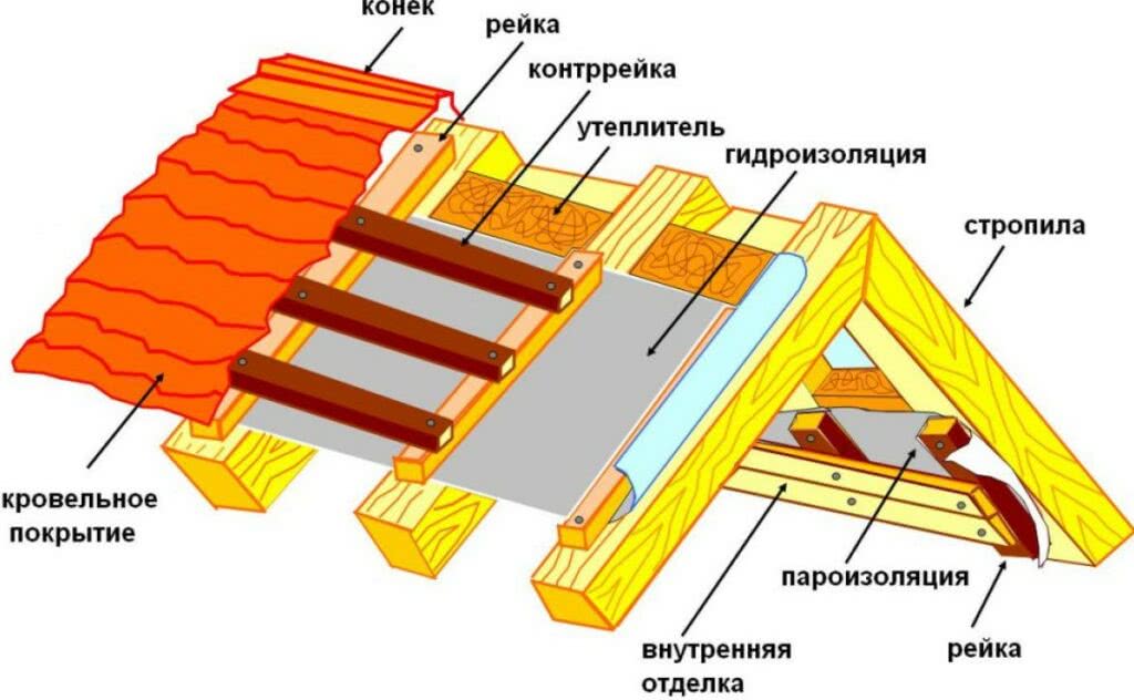 Монтаж кровельного профнастила осуществляется на обрешетку, которая расположена либо поверх стропил, либо поверх утеплителя.