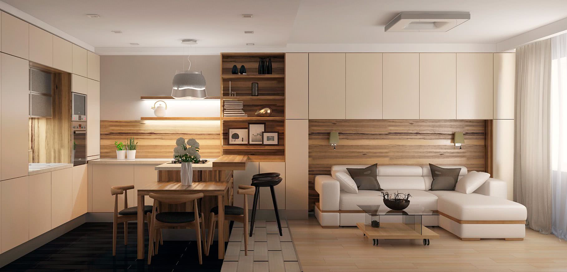 - Рациональное использование жилой площади. Здесь можно разместить три зоны: место для приготовления пищи, для ее приема, для организации досуга и отдыха.