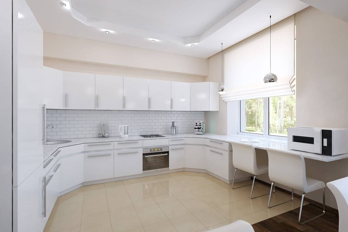 - На кухне можно расположить все необходимые кухонные предметы, мебель, технику, появляется возможность расширения рабочей поверхности.