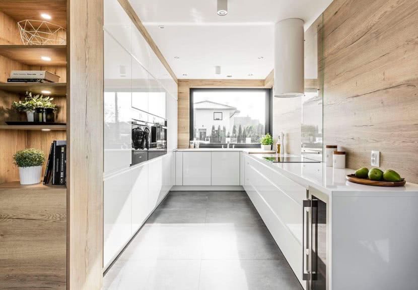 Встретить угловую кухню с большим окном в частном доме можно в современных архитектурных стилях. В них приветствуется минимализм и много стекла в оформлении. Есть несколько вариантов интерьера, если на кухне большое вытянутое по форме окно: