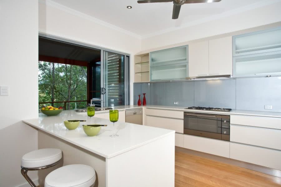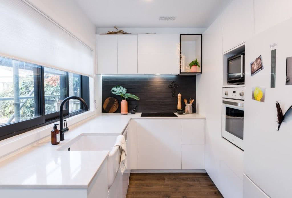 Стильно смотрится молочный или черно-белый интерьер в такой кухне. К основному светлому тону можно добавить несколько ярких акцентов. Как пример, красочные жалюзи или декорированная столешница.