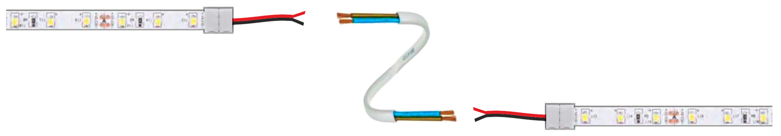В любом случае, светодиодную ленту можно спокойно разрезать по специальным перемычкам и подключать отрезки последовательно друг у другу. Для каждого разрыва понадобится два зажимных коннектора типа «провод — лента» и собственно провод, например шнур ШВВП. Шнур прокладываете по гарнитуру, к участкам ленты выводите его через отверстия в дне шкафов.