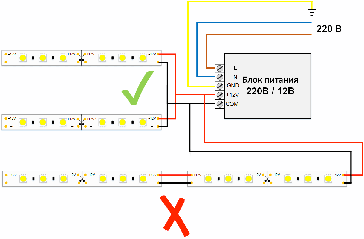 Рассмотрим несколько схем подключения к лентам. Выберете подходящую вам. Начнем с того, как выполняется простое соединение, для какого используется лента на 12 В и БП с мощностью 600 Вт.