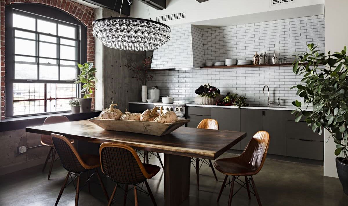 В просторной кухне будет отлично смотреться стол из массива с мягкими стульями с высокой спинкой. Каретная стяжка, которая знакома нам как частый элемент классических и изысканных интерьеров, отлично уживается с индустриальными мотивами.