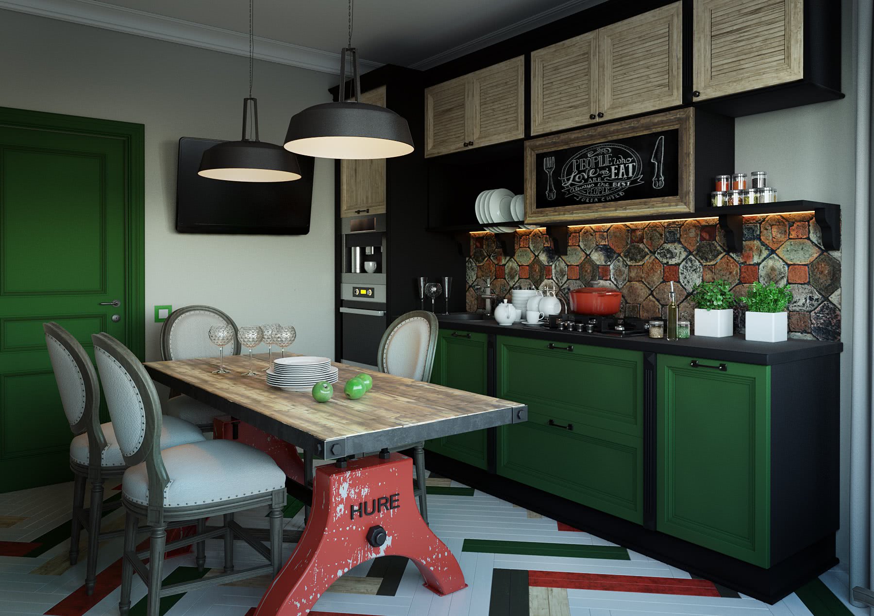 Лофт и прованс — этот интересный симбиоз индустриальных штрихов и шика французской деревни будет отлично смотреться на кухне-гостиной или в квартире-студии. Основными тонами выступают белый и нефрит