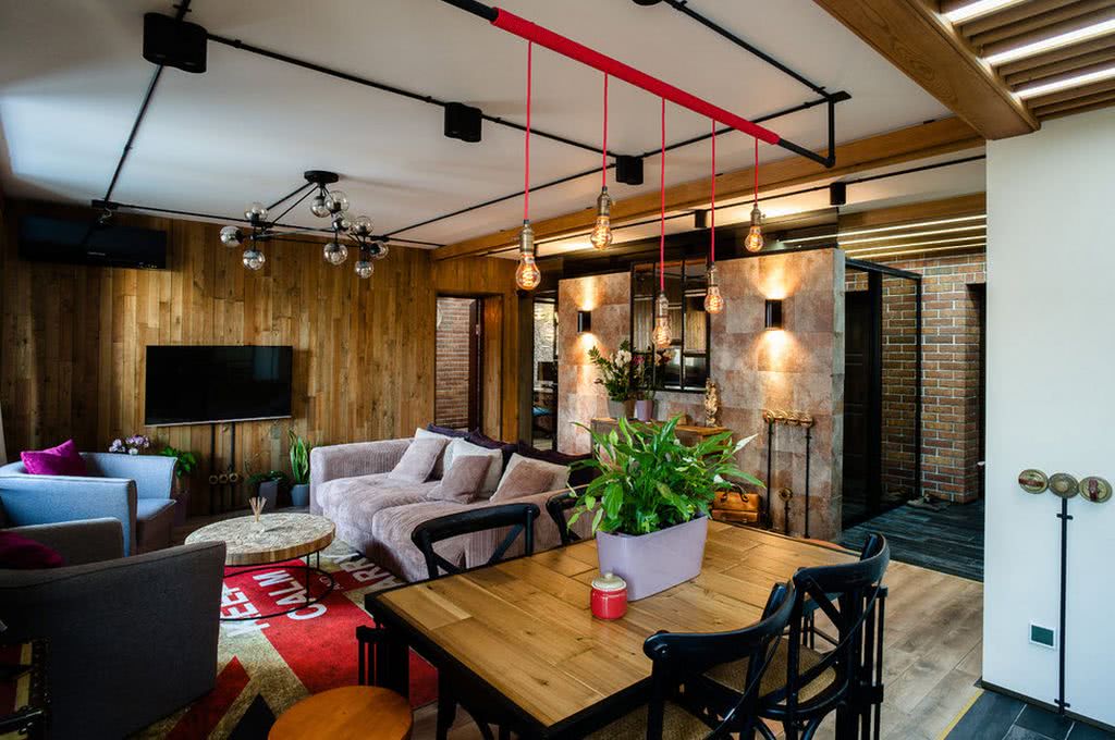 Для организации освещения используйте подвесные лампы, напоминающие промышленные светильники или уличные фонари. Сейчас в магазине можно найти люстры в виде обычной лампочки, подвешенной на длинном проводе к потолку.